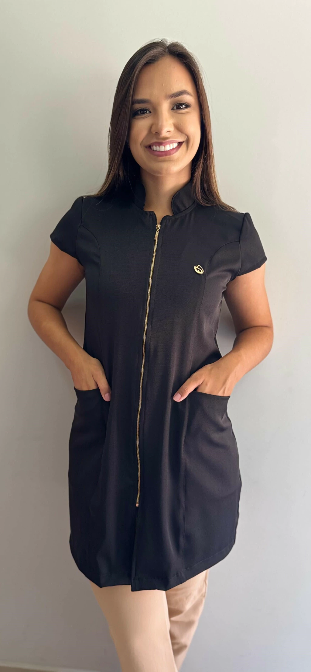 Desenvolvido para quem busca conforto e funcionalidade nos atendimentos, Sua gola padre dá um toque mais sofisticado e destaca-se pelo seu fechamento em zíper dourado. Além do design elegante, o zíper central facilita o vestir, enquanto os bolsos laterais oferecem praticidade. Possui mangas curtas, deixando o jaleco mais fresco.