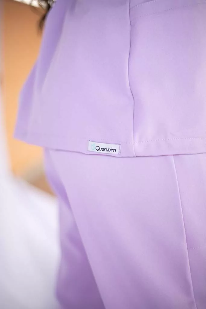 Sua blusa, ou scrub, tem dois bolsos frontais grandes. A gola em formato V. Levemente acinturada. Do lado esquerdo, na altura do colo, é encontrado o pingente Querubim.